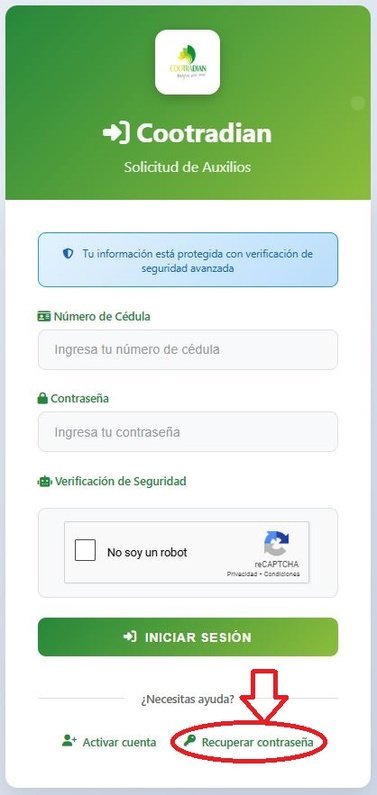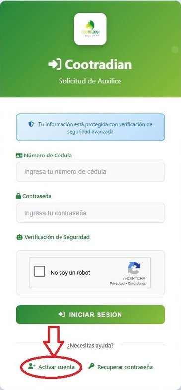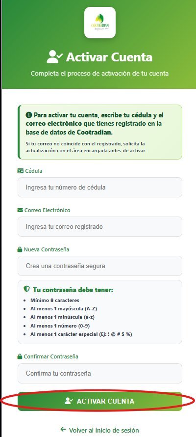 Completa los campos con su número de cédula y tu correo electrónico (valide que sea el mismo registrado en COOTRADIAN). Cree una contraseña segura y confírmela.