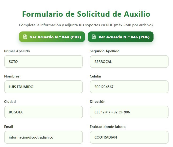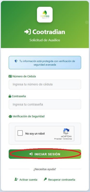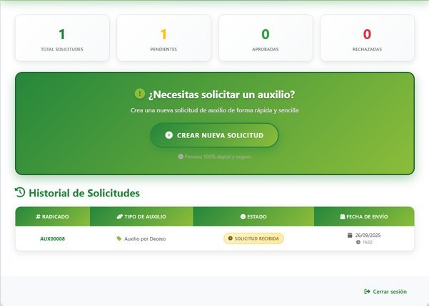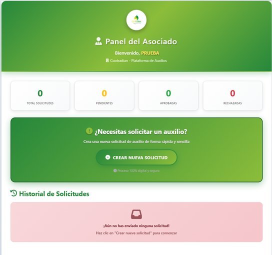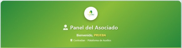El Panel del Asociado es la interfaz principal de la Plataforma de Auxilios de Cootradian. Desde este punto, cada asociado tiene la posibilidad de revisar y administrar sus solicitudes de auxilio.