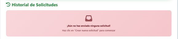 Si no existen solicitudes registradas, el sistema mostrará el mensaje:“¡Aún no has enviado ninguna solicitud! Haz clic en ‘Crear nueva solicitud’ para comenzar”.