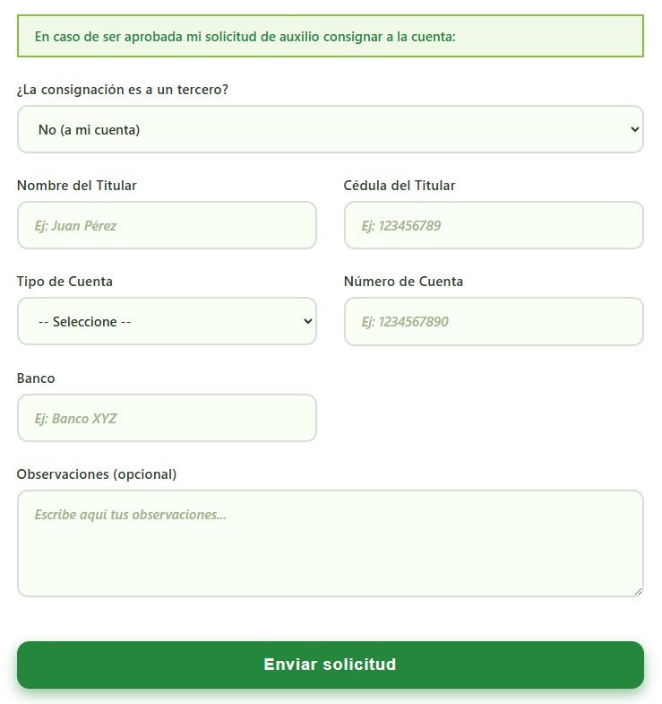 En caso de aprobación, el auxilio será consignado en la cuenta indicada por el asociado. Para ello debe registrar:
