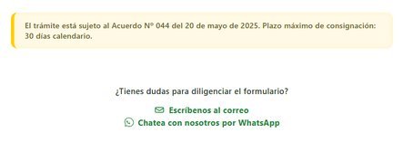 El trámite está sujeto al Acuerdo N.° 044 del 20 de mayo de 2025 y al Acuerdo Nº 046 del 22 de octubre de 2025, con un plazo máximo de consignación de 30 días calendario.